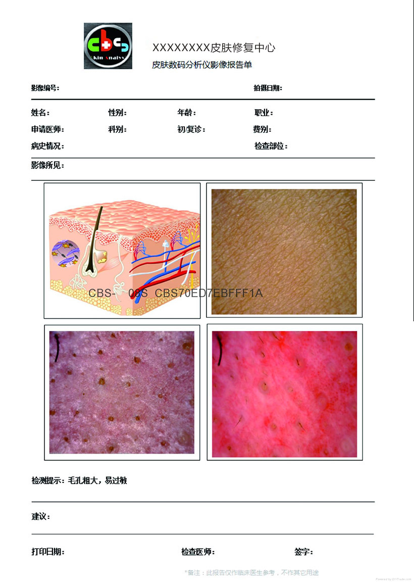 a、通过拍摄一张面部肌肤图片,瞬间分析出油份、水分、色素、毛孔、弹性、及皮肤胶原蛋白纤维的准确数据,例如“皮肤油份含量19%”,并得出结论“皮肤比较油”,且自动弹出对话框,推荐出相关的平衡油脂的产品(在使用产品后再进行检测,可以看到检测数据以及结果的变化,增强客人对产品的信心和购买意愿。),所有项目分析完之后,会生成皮肤检测报告,并可打印报告;